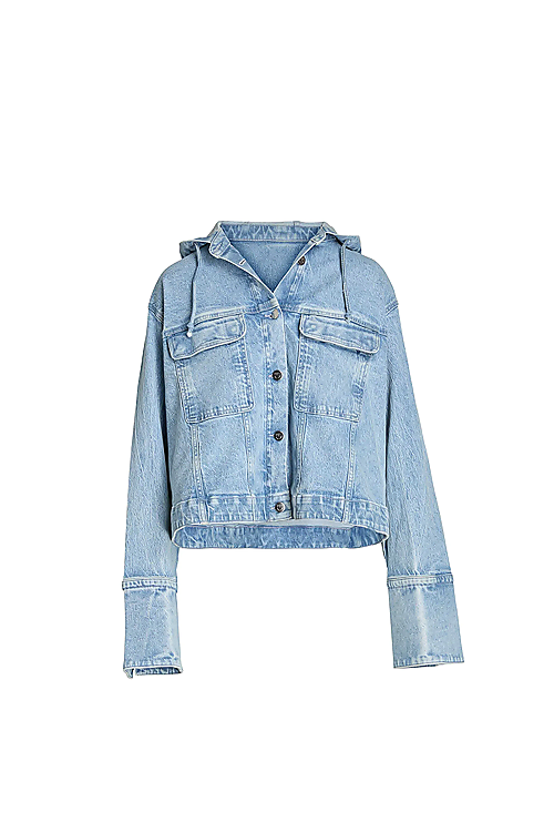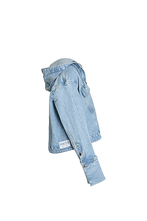 Die Denim 27_THE SUIT UP kommt in Organic authentische vintage Denim Qualität. Sie ist in hellblauer Waschung mit used Effekten erhältlich. Besondere Details sind die Kapuze mit Kordel und die aufgesetzten Pattentaschen. Sie ist oversized und leicht verkürzt geschnitten.