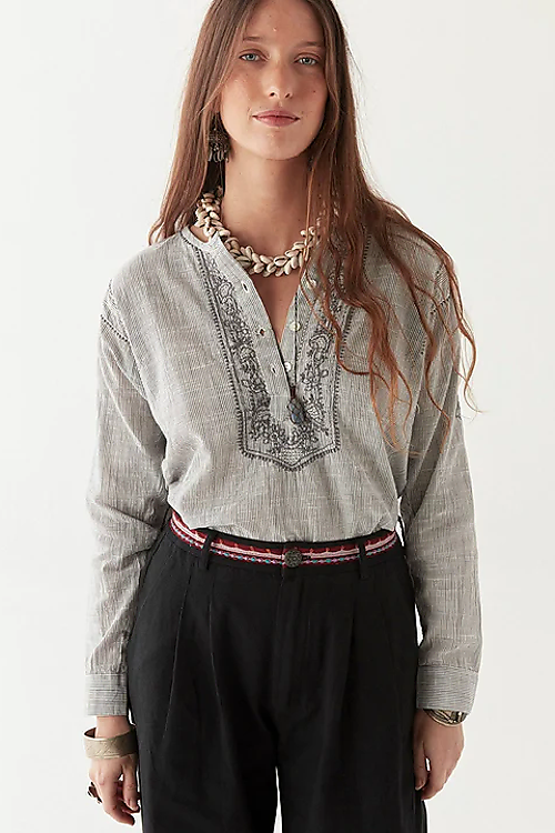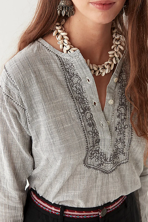 Diese gestreifte Bluse von Maison Hotel bringt mit aufwendiger Stickerei an Vorderseite und Manschetten einen Hauch Boho-Chic in deinen Alltag. Die lockere Passform und der leichte Stoff sorgen für Komfort, während Details wie der Schlitz am Ausschnitt den Look abrunden.