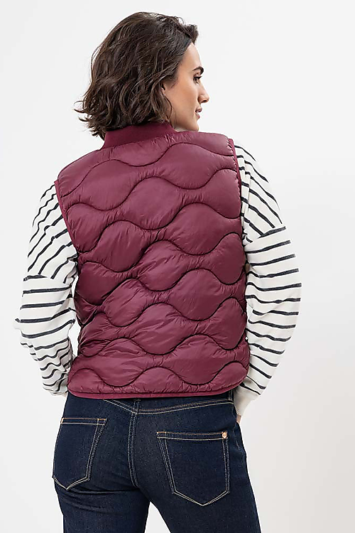 Leichte Steppweste mit glänzender Oberfläche und markanter, rund verlaufender Steppung. Der Bomberkragen und der durchgehende Reißverschluss geben ihr einen sportlich-modernen Look. Wärmend gefüttert, dabei angenehm leicht und beweglich – ideal zum Layern über Hoodie, Strick oder Hemd in Übergangszeit und an kühlen Tagen. Passform: regular, hüftlang