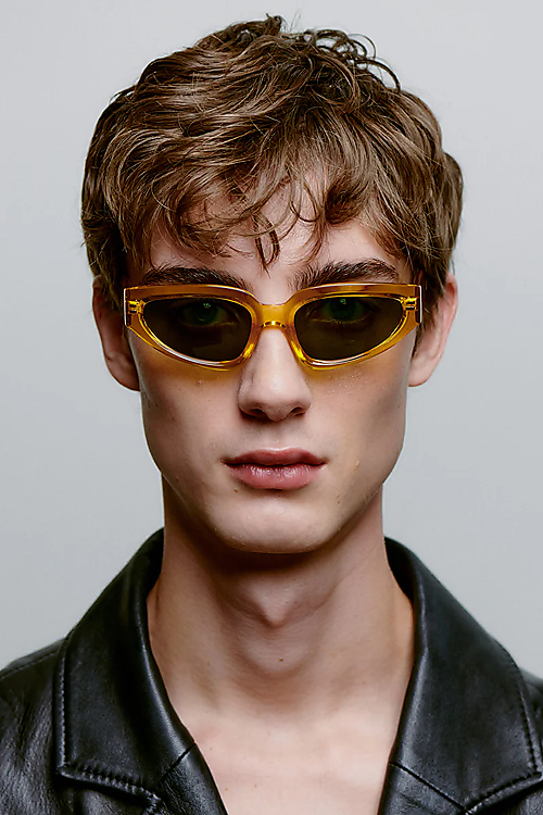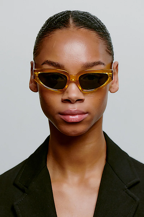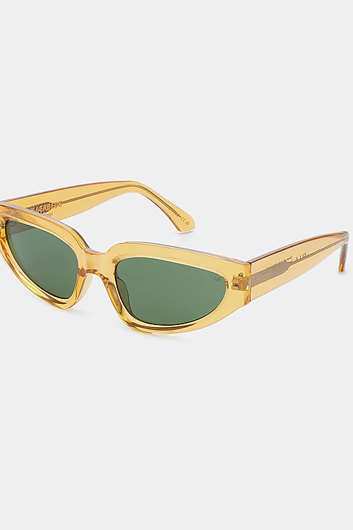Diese Sonnenbrille mit gelbem Rahmen und grünen Gläsern sorgt für einen auffälligen, frischen Look. Die schmale Cat-Eye-Form bringt eine Portion Vintage-Charme ins Outfit und verleiht deinem Style eine verspielte Note. Perfekt für sonnige Tage mit einem Hauch Nostalgie!