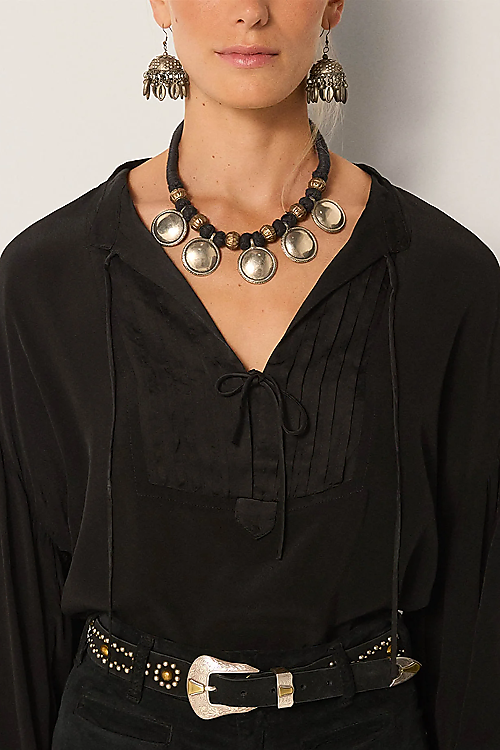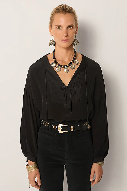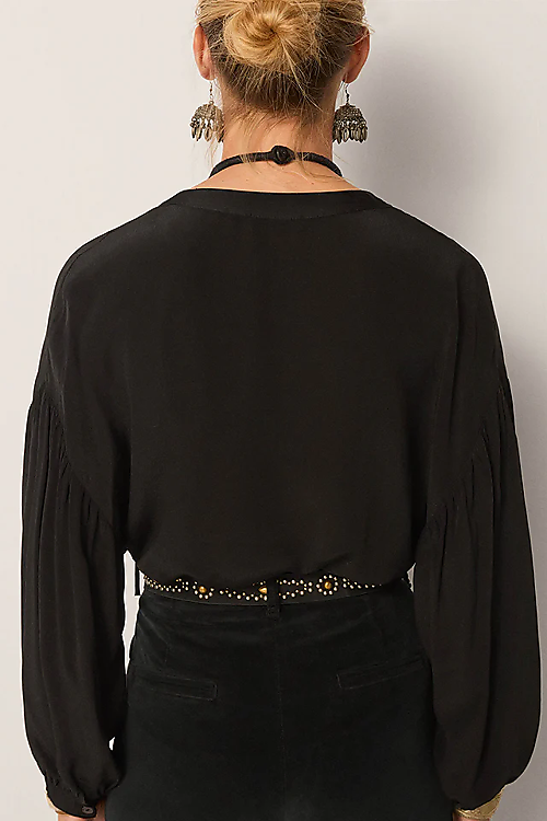Gefertigt aus seidiger Viskose, fällt diese Bluse mit leiser Fluidität und behält zugleich ihre Definition durch das maßgeschneiderte Bib-Front-Detail. Der tiefe Schwarztton verleiht zeitlose Vielseitigkeit – edel, aber kraftvoll.