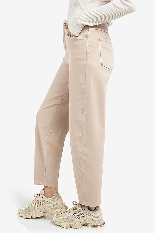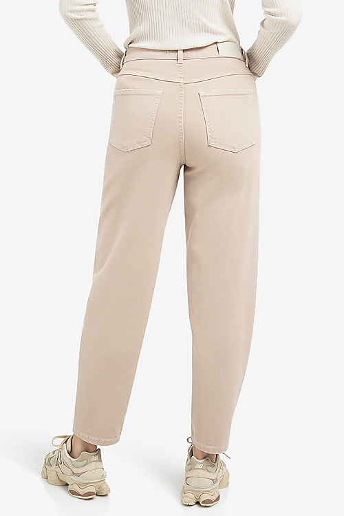 Diese bequeme Jeans aus weichem beigefarbenem Denim hat eine lockere Passform und einen hohen Bund. Sie begeistert mit einem klassischen Fünf-Taschen-Design und einem markanten V-förmigen Detail hinten am Bund. Das gerade Bein verleiht der Jeans eine entspannte Note. Das Model ist 178 cm groß und trägt Größe 36.