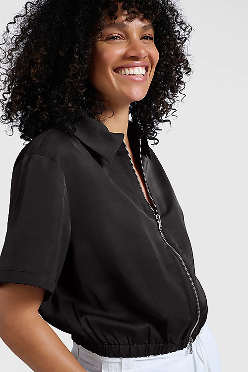 Diese elegante Satinjacke begeistert mit einer lockeren Passform und einem dezenten Glanz. Sie hat kurze Ärmel, einen klassischen Kragen und einen Reißverschluss auf der Vorderseite. Die Jacke bietet einen modernen und gleichzeitig zeitlosen Look. Der elastische Bund sorgt für eine schmeichelhafte Silhouette und zusätzlichen Komfort. Die Jacke ist die perfekte Wahl für ein stylishes Outfit.