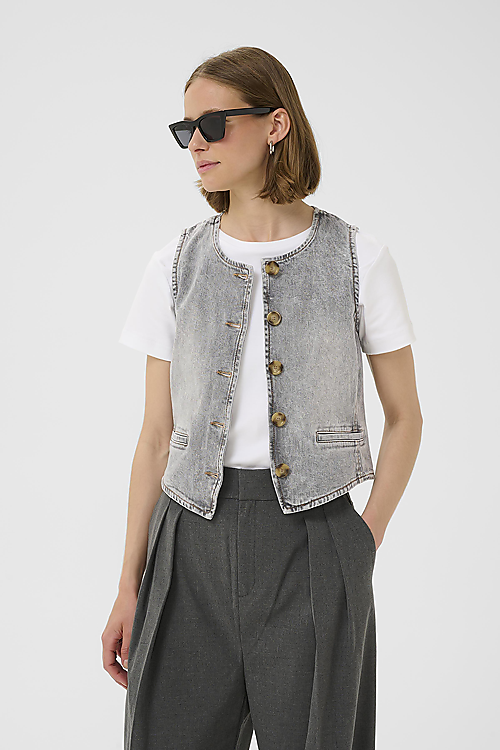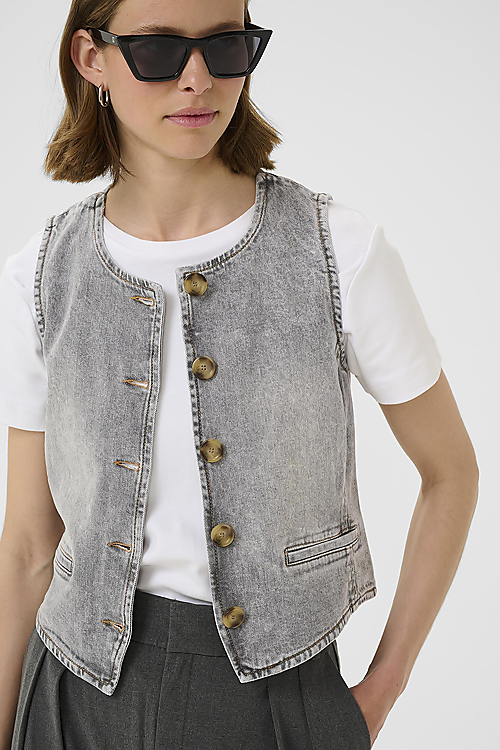Diese Jeansweste präsentiert sich mit lockerer Passform, Rundhalsausschnitt und Knopfleiste. Angenehm zu tragen und vielseitig kombinierbar für verschiedene Anlässe.