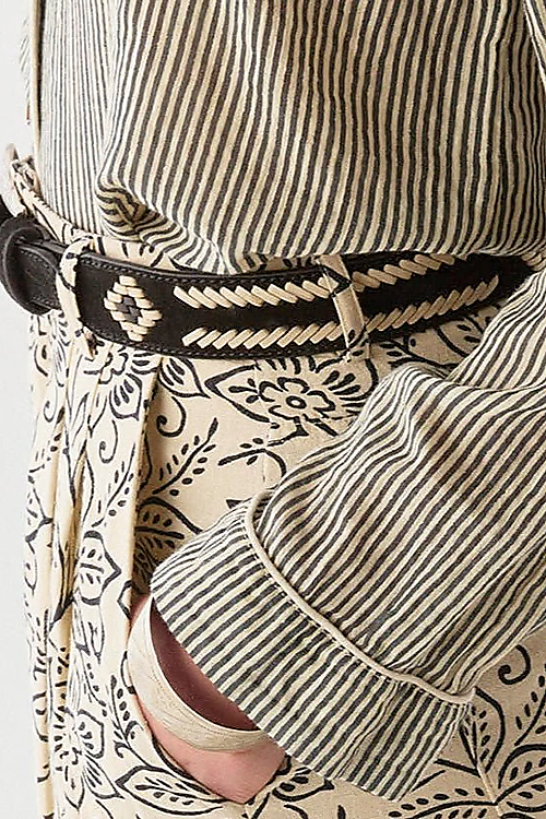 Schwarzer Ledergürtel mit kontrastreichem, weißem Flechtmuster und silberfarbener, gravierter Westernschnalle. Ein echtes Statement-Piece für Jeans, Kleider oder als Taillengürtel über Blazern.