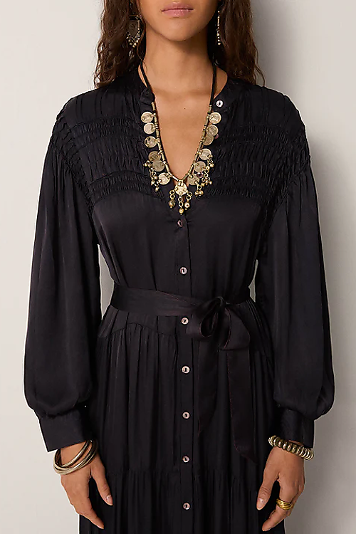 Der Stoff fällt mit Gewicht, jedoch ohne Schwere, und ist in großzügige Stufen gearbeitet, die sich mit der Bewegung öffnen. Smock-Details an den Schultern schenken Komfort und feine Textur.