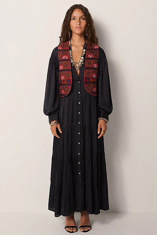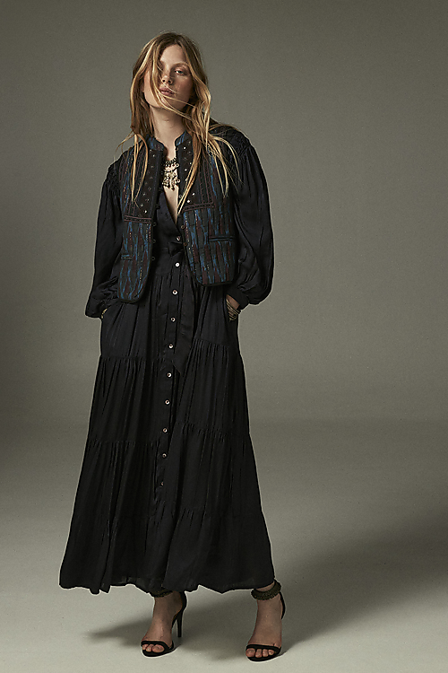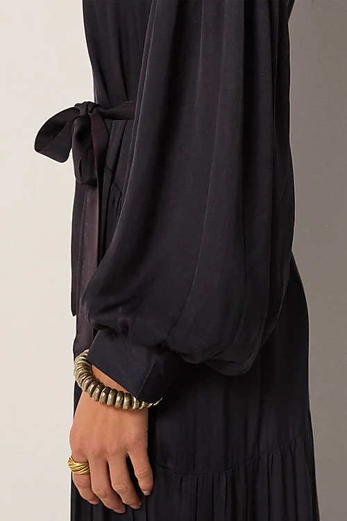 Volle Ärmel laufen in schmale Manschetten aus, während die lange Silhouette in breiten Stufen zum Saum hin ausläuft. Ein Bindegürtel aus demselben Stoff akzentuiert die Taille bei Bedarf – oder das Kleid bleibt locker getragen für maximale Leichtigkeit.