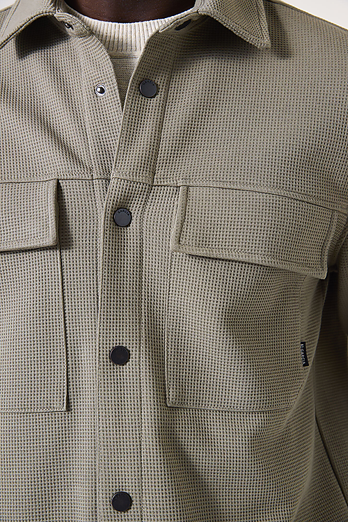 Stilvolles Overshirt mit einem klassischen Kragen, langen Ärmeln, zwei aufgesetzten Taschen auf der Vorderseite und Druckknopfverschluss. Dies sorgt für eine praktische und trendige Ausstrahlung. Es besteht aus 60% Baumwolle und 40% recyceltem Polyester, was zu einem komfortablen Trageerlebnis beiträgt.