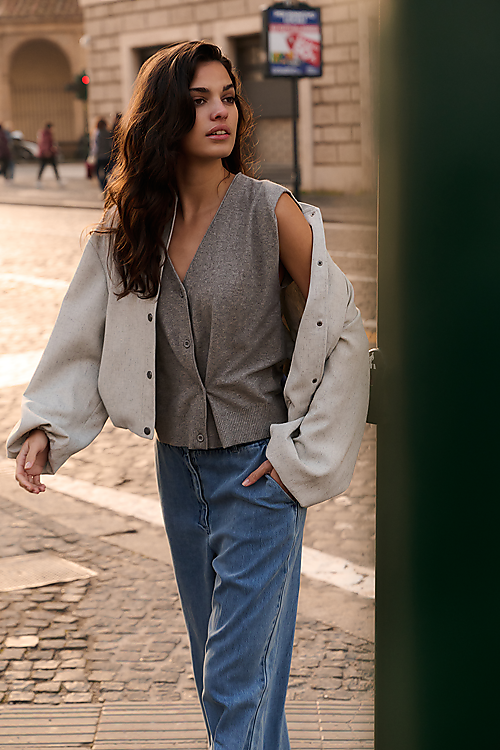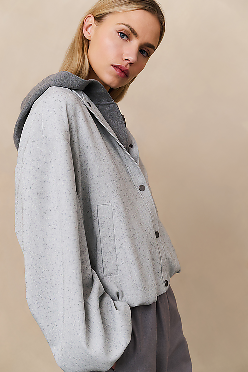 Diese bequeme Jacke hat eine dezente Ballonform, die durch den elastischen Saum noch betont wird. Sie hat einen Stehkragen, überschnittene Schultern, lange Ärmel und einen matten Druckknopfverschluss. Der weiche Stoff und das minimalistische Design machen sie ideal für einen modernen, lässigen Look.