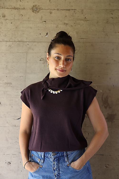 Kurzarm Strickpullover aus feinster Merinowolle. Mit einem Knöpfchen ist der dazugehörige Schal befestigt.