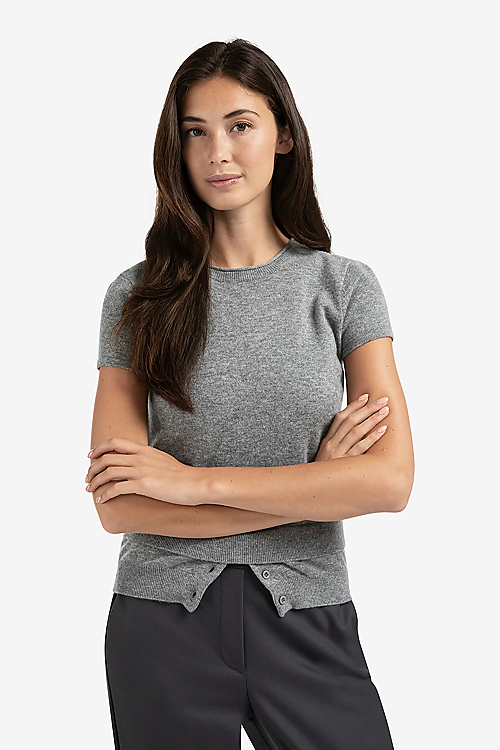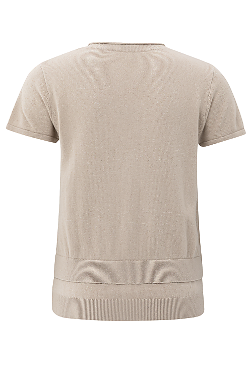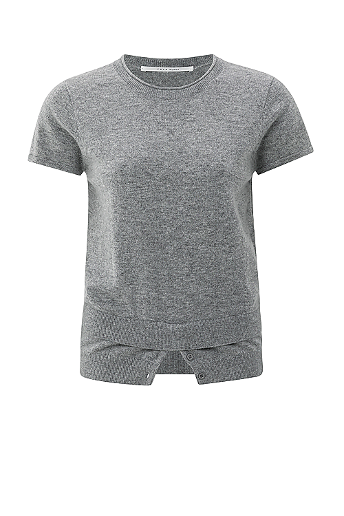 Dieses Feinstrickoberteil hat kurze Ärmel, einen Rundhalsausschnitt und eine lockere Passform. Der Saum im Lagenlook mit Knopfdetails erweckt den Eindruck, das Oberteil hätte mehrere Schichten, und verleiht ihm eine verspielte, moderne Note. Aus weichem, bequemem Stoff gefertigt. Die perfekte Wahl für einen stylishen, lässigen Look.