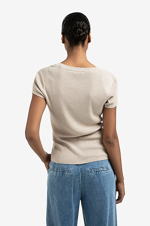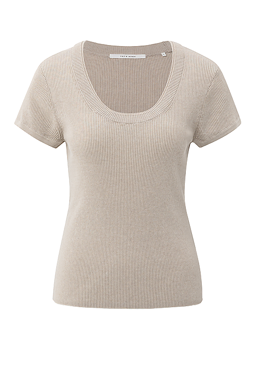 Dieses Feinstrickoberteil besticht durch kurze Ärmel und einer eleganten doppelten Linie entlang dem Ausschnitt. Es ist aus weichem geripptem Stoff gefertigt und bietet eine schmeichelhafte schmale Passform. Da es hüftlang ist, lässt es sich perfekt sowohl eingesteckt als auch über der Hose oder dem Rock tragen. Ein raffiniertes Modell mit dezent überraschender Note, das in keiner Garderobe fehlen sollte. Es lässt sich perfekt als Teil eines Lagenlooks oder solo tragen.