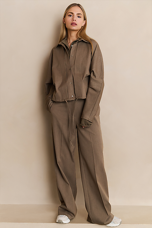 Lässig und stilvoll zugleich: Diese weit geschnittene Hose in warmer Taupe-Nuance punktet mit einem hohen Bund und abnehmbarem Gürtel mit Ösendetail.