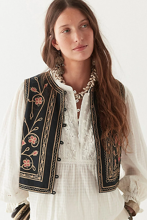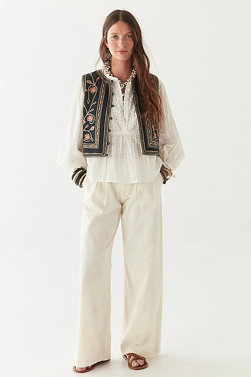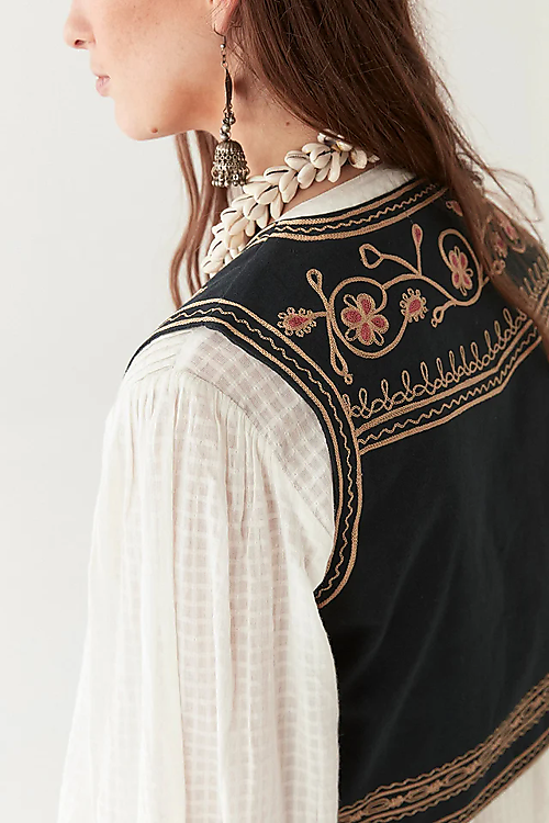 Direkt aus der Traumwelt von Hendrix – elektrisch, ungezähmt, voller Rebellion. Mitternachtsschwarze Baumwolle, bestickt mit wilden Stickereien in Gold und tiefem Karminrot, wie verschlungene Ranken, die über einen Verstärker kriechen. Verschnörkelt, hypnotisch, voller Bewegung.