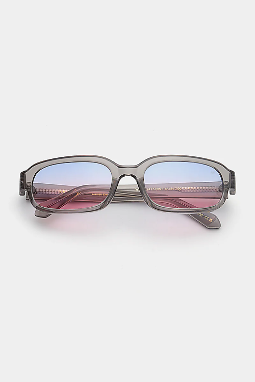 Diese trendige Sonnenbrille überzeugt mit einem markanten, rechteckigen Rahmen in transparentem Grau und stylischen Gläsern im sanften Farbverlauf von Blau zu Rosa. Die Linsen aus robustem Polycarbonat bieten zuverlässigen UV-400-Schutz – perfekt für sonnige Tage mit modischem Statement.